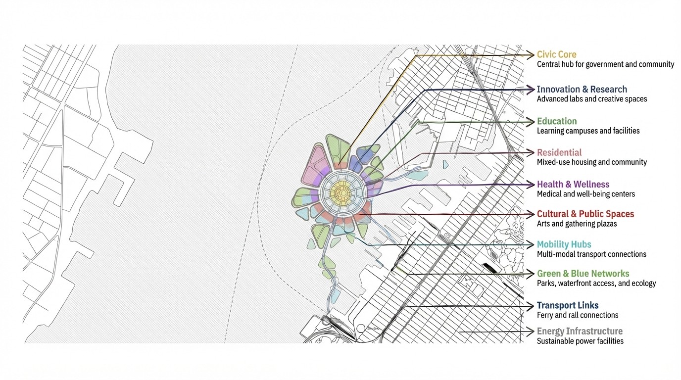 Compass Islands is a visionary floating innovation district off the coast of Brooklyn, designed to host civic, research, cultural, and residential programs on modular, resilient platforms. Inspired by the geometry of the compass, the masterplan blends urban innovation with ecological integration—reimagining New York’s waterfront for a climate-adaptive future.